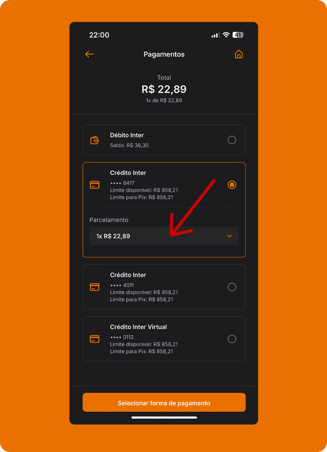 Selecione o cartão de crédito e a quantidade de parcelas e clique em "Selecionar Forma de Pagamento".