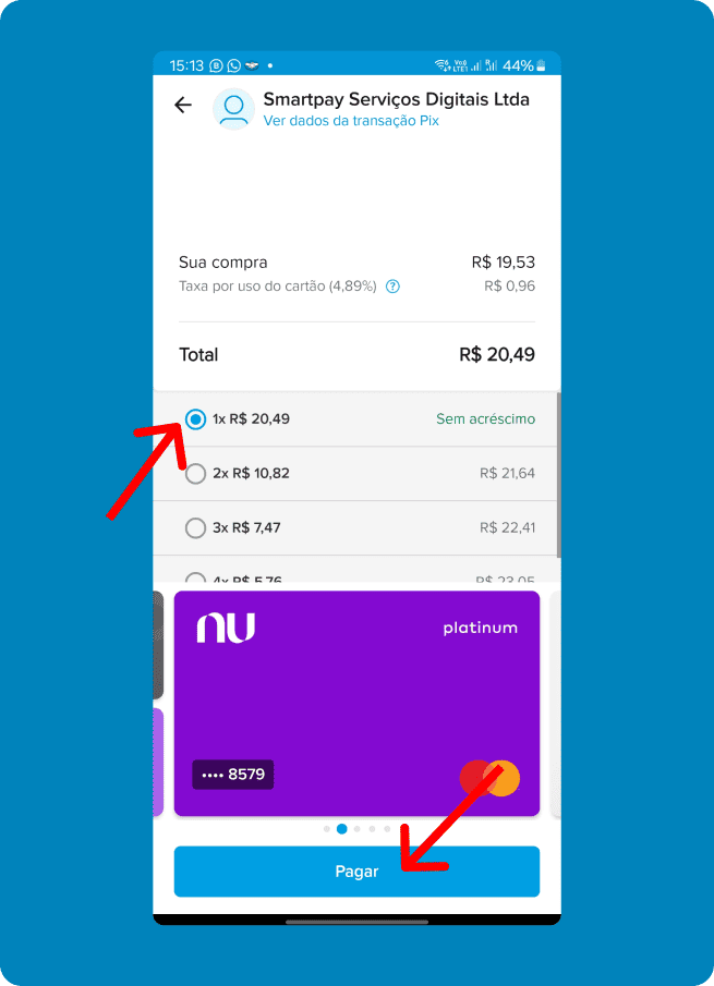 Selecione o número de parcelas e o cartão de crédito que deseja usar e clique em "Pagar".