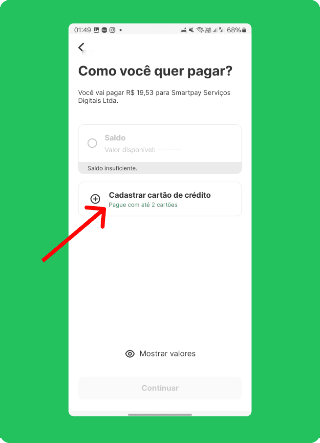 Selecione a opção "Cadastrar Cartão de Crédito" e clique em "Continuar".